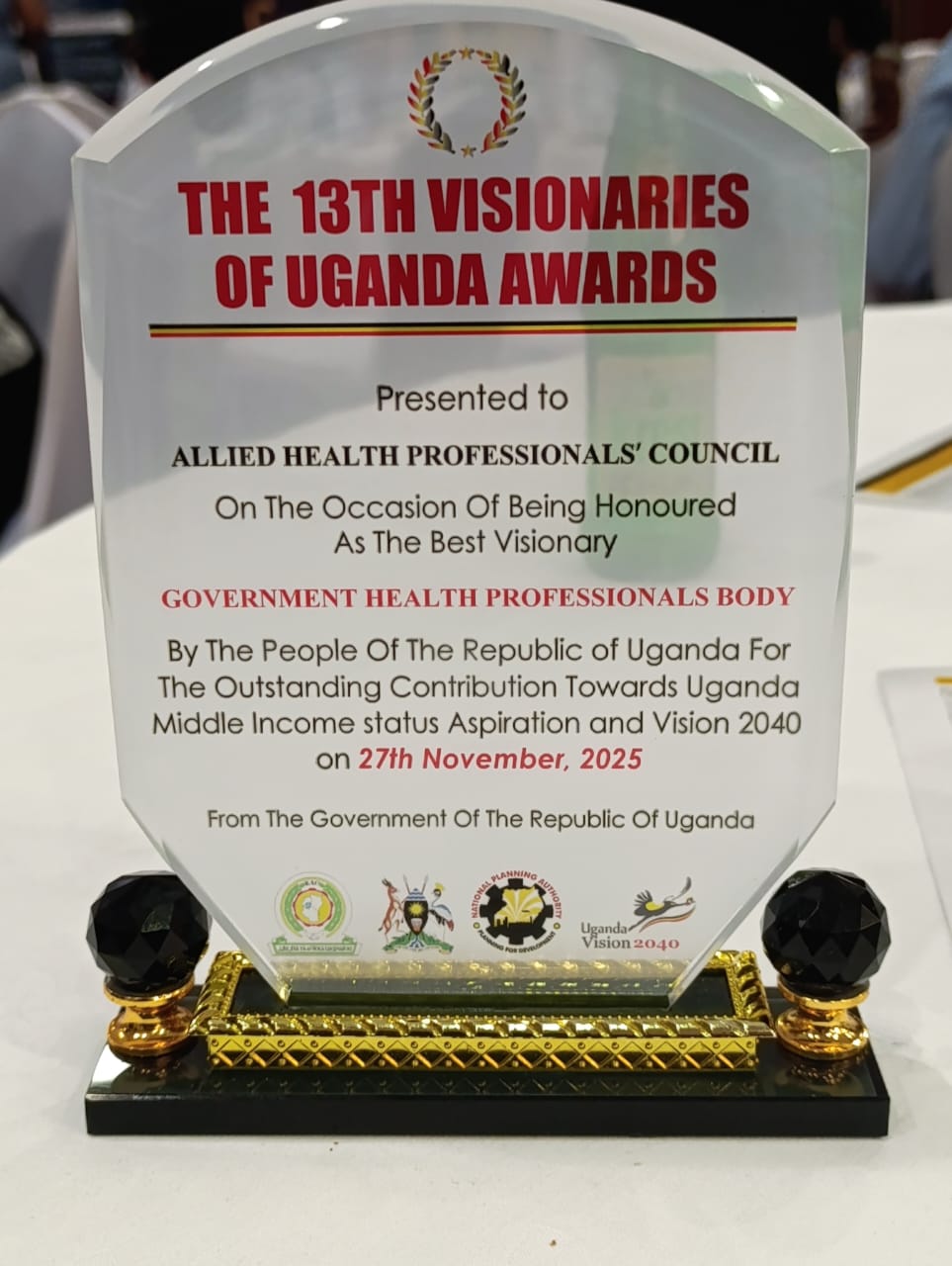 The Allied Health Professionals Council (AHPC) is honored to receive the Best Visionary Government Health Professionals Body_ 2025 award at the 13th Visionaries of Uganda Awards. Presented by H.E. Maj.(Rtd) Jessica Alupo, Vice President of Uganda, this recognition celebrates AHPC's contribution to professional regulation and excellence in Uganda's health sector.